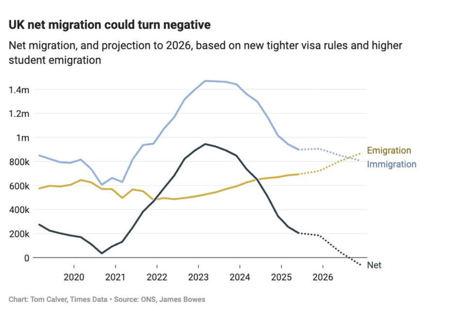 There has not definitely been a big turning point yet, but both trend lines are suggestive that something is changing. Particularly given the likely future trend in net immigration, which Fraser Nelson has pointed out, drawing on analysis from The Times: